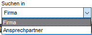 Mit dem Kombinationsfeld Suchen in kann aus dem Menü zwischen den Kategorien Firma und Ansprechpartner gewählt und damit festgelegt werden, ob in den Firmendaten oder in den Kontaktdaten der Ansprechpartner gesucht werden soll. Bei der Suche werden alle Felder der zu durchsuchenden Kategorie einbezogen.
