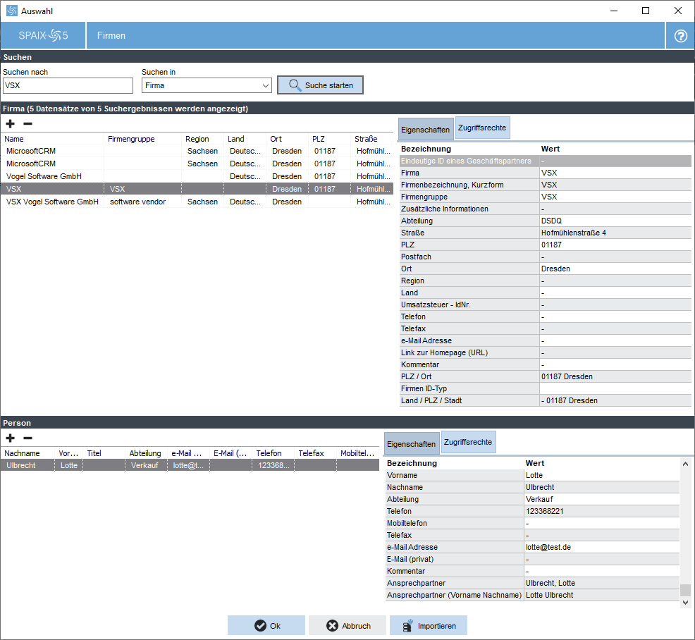 endgültig zu löschen. Je nachdem, ob eine Firma oder eine Person in der Liste markiert ist, stehen im rechten Bereich Details verschiedene Ansichten zur Verfügung.