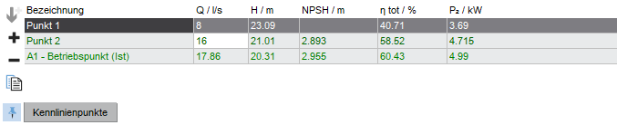 Zusätzliche Punkte können mit dem Plus-Schalter Hinzufügen hinzugefügt werden. Es wird eine neue Zeile in der Tabelle erstellt, in welcher der Wert für den Förderstrom eingegeben werden kann. Die weiteren Werte werden automatisch berechnet und beziehen sich immer auf die derzeit aktive Kennlinie.